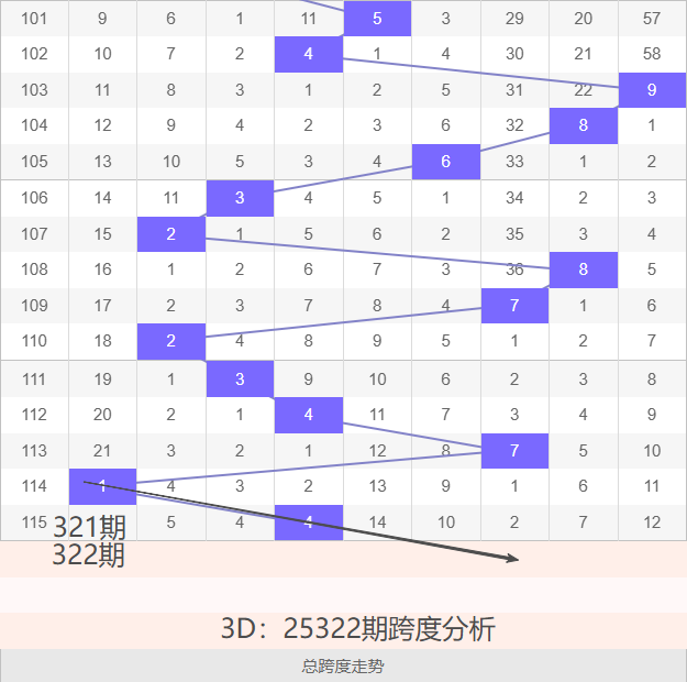 近3期跨度变化不大,上期振幅3,近期10期跨度分别为:3跨,2跨,8跨,7跨,2跨,3跨,4跨,7跨,1跨,4跨,大跨度近期有开始走强的趋势,跨度目前整体是明显的开始偏向于大跨度的,本期个人预期跨度是可能走向大跨度,可参考:6跨 ,7跨,8跨,同时防 :1跨,2跨,5跨,