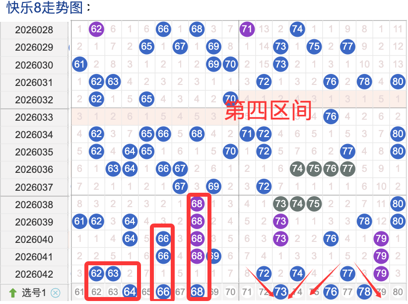 上期四区间开出了6个奖号(62.63.72.74.77.79)上期的四区开6个奖号呈现了一个递增的趋势,开出的奖号7头回补4个6头回补2个,先来看号码64在近 30 期内属于还是很稳定的号码,近期出现频率相对较热,偶尔会间隔多期后出现一次,这个号码要注意防守,号码66具有一定的间歇性近期活跃度较稳定比如有时会间隔 35期就再次出现,也有时会间隔多期,近期整体出现频率比较,近期还是要关注的.号码73活跃度近期比较,有一定的间歇性。活跃度近期较热,整体走势有一定的波动性.