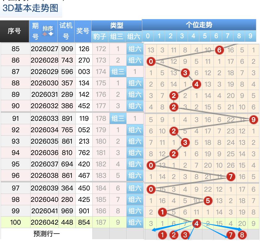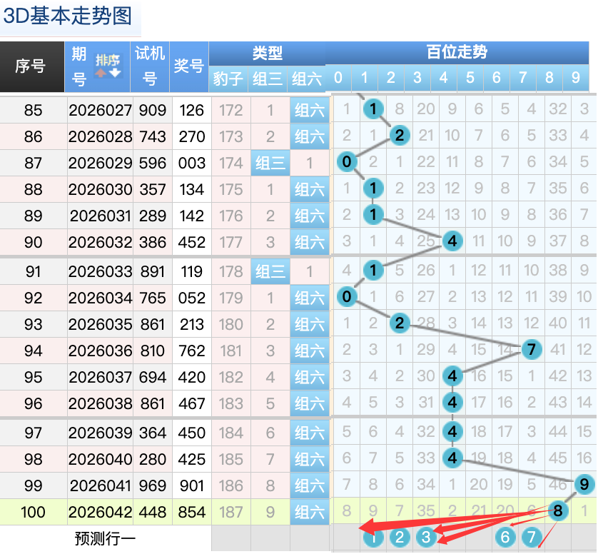 3D上期百位开出的8球,这个奖号8是一个冷码回补落位趋势也是一个比较好的符合百位上的落位点,先来看1号球这里还是有机会继续走出一个小号码落位小周期回补趋势,还有一个就是3号球这里的是一个大冷号的落位形态的概率在这里的机会还是很好的要注意防守,然后6号球这里要注意是一个冷码回补落位趋势注意防守9号球在百位上要注意可能有机会走折返的落位注意防守 。