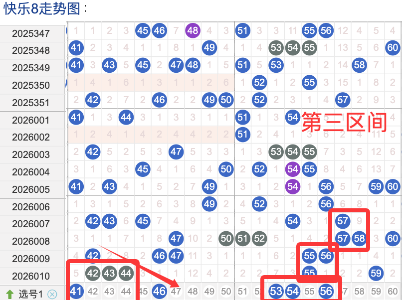 三区间开出了5个奖号(42.43.44.55.59)上期回顾三区开出5个奖号上期的三区间的奖号数量呈现一个不变的形态,4头回补3个号码,本期先来看号码41近期出现频率相对来说还是很稳定。偶尔有时间隔期数也是很长,说明其在近期的开奖中较热的,号码46在近 30 期内出现次数相对是稳定的号码,近期的活跃度也是较热。号码53有一定的间歇性,通常间隔5-4期会出现一次,没有明显的连续出现态势,走势相对较温热,在整个第三区间的表现本期还是可以防守的。号码56走势相对近期较温热,近期没有连续间隔落号的情况,活跃度近期处于较温热状态注意防守。