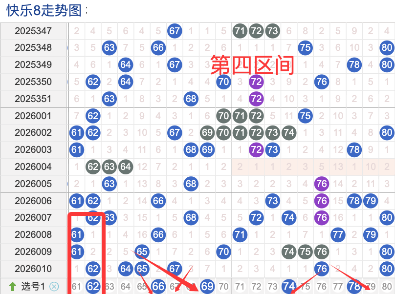 上期四区间开出了6个奖号(62.64.65.67.76.80)上期的四区开6个奖号呈现了一个递减的趋势,开出的奖号7头回补1个,6头回补4个,先来看号码62在近 30 期内属于还是很稳定的号码,近期出现频率相对也是稳定的,偶尔会间隔多期后出现一次,这个号码要注意防守,号码69具有一定的间歇性活跃度较温热比如有时会间隔 3到5期就再次出现,也有时会间隔多期,近期整体出现频率比较温热,近期还是要关注的.号码78活跃度近期比较热,有一定的间歇性。活跃度近期较温热,整体走势有一定的波动性.