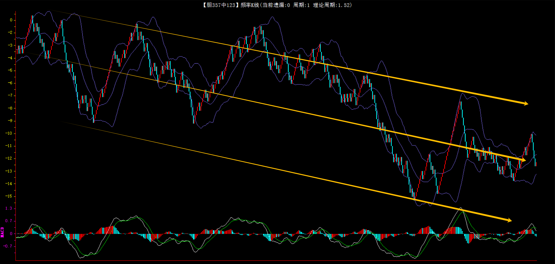 整体趋势下行,上边沿线趋势向下,下边沿趋势也是向下,节点震荡,当前开1期,本期防守。