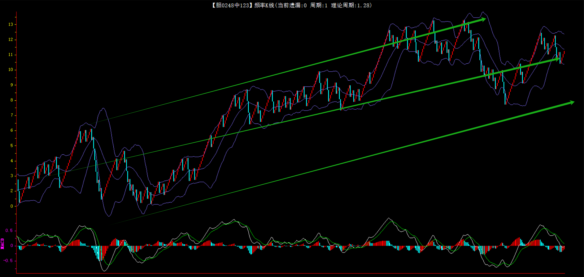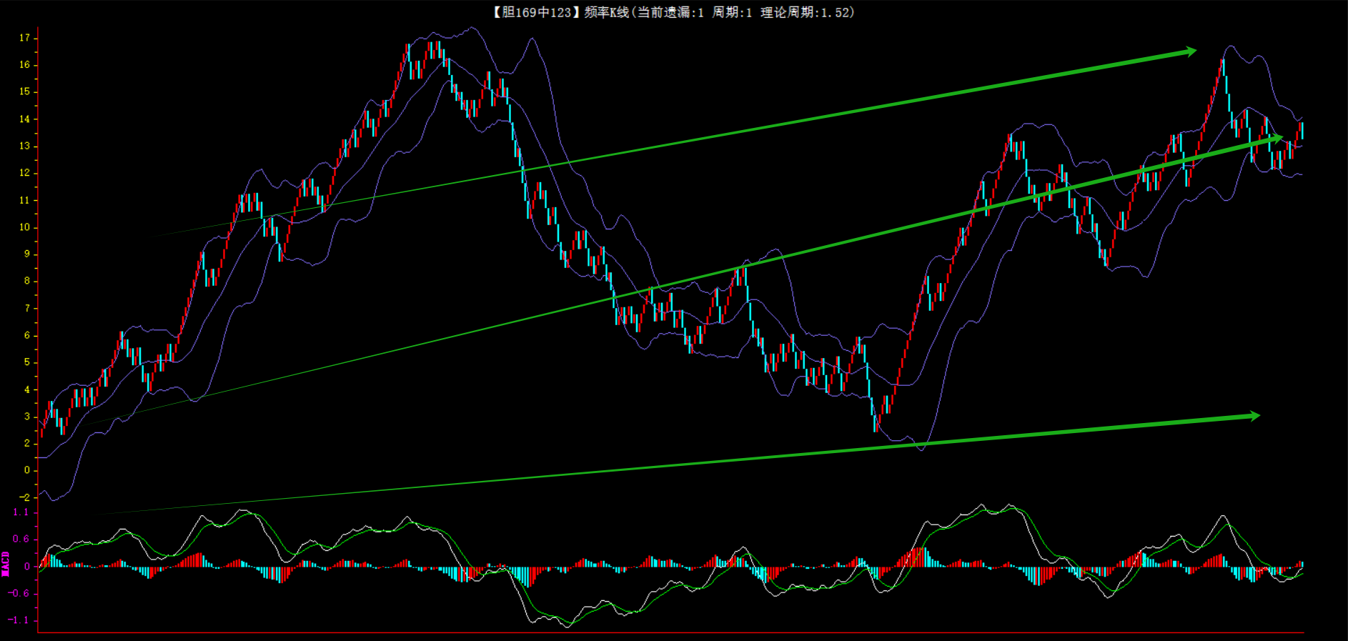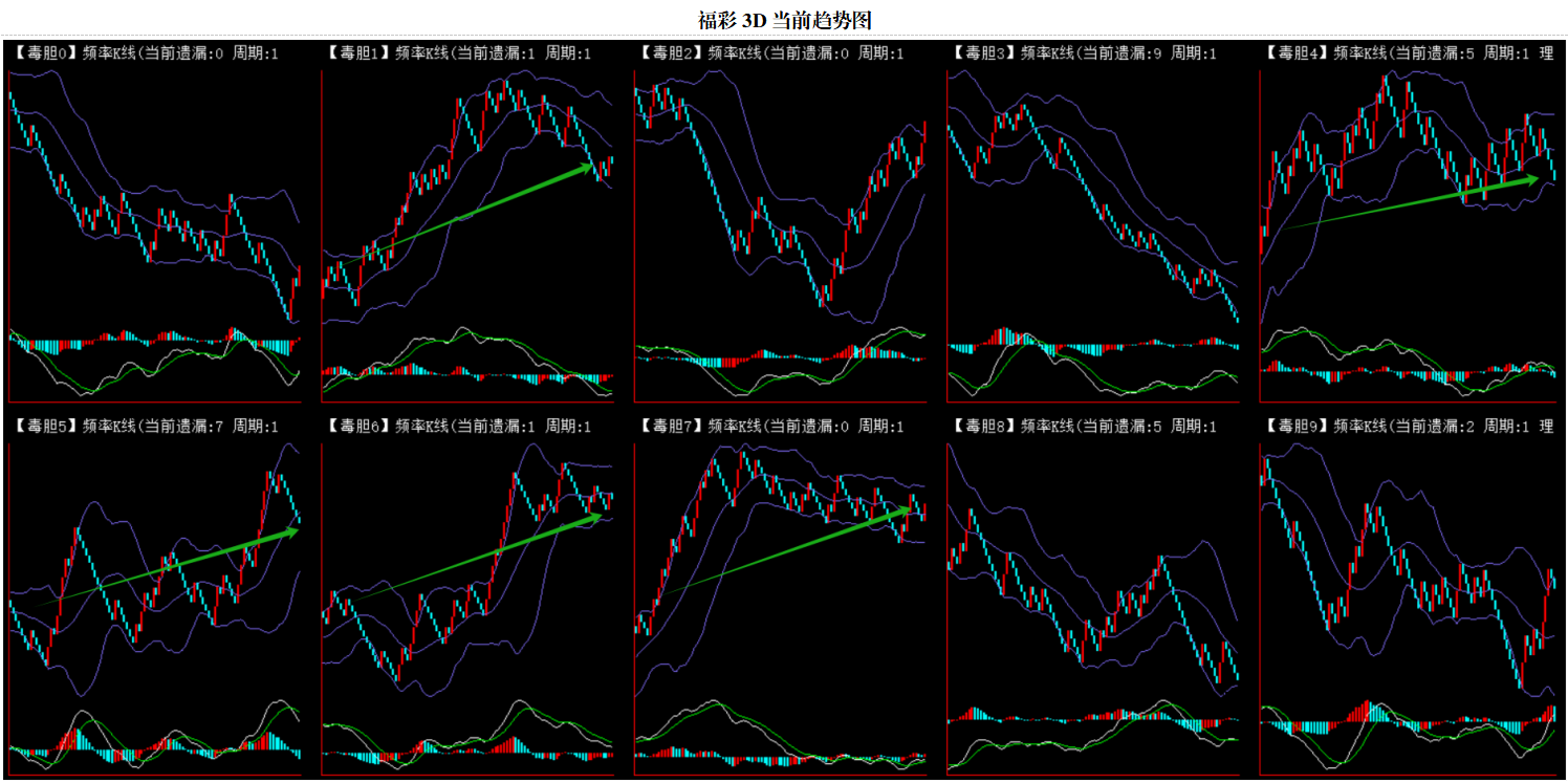 整体趋势上行,上边沿线趋势向上,下边沿趋势也是向上,节点震荡,当前遗漏1期,本期关注。