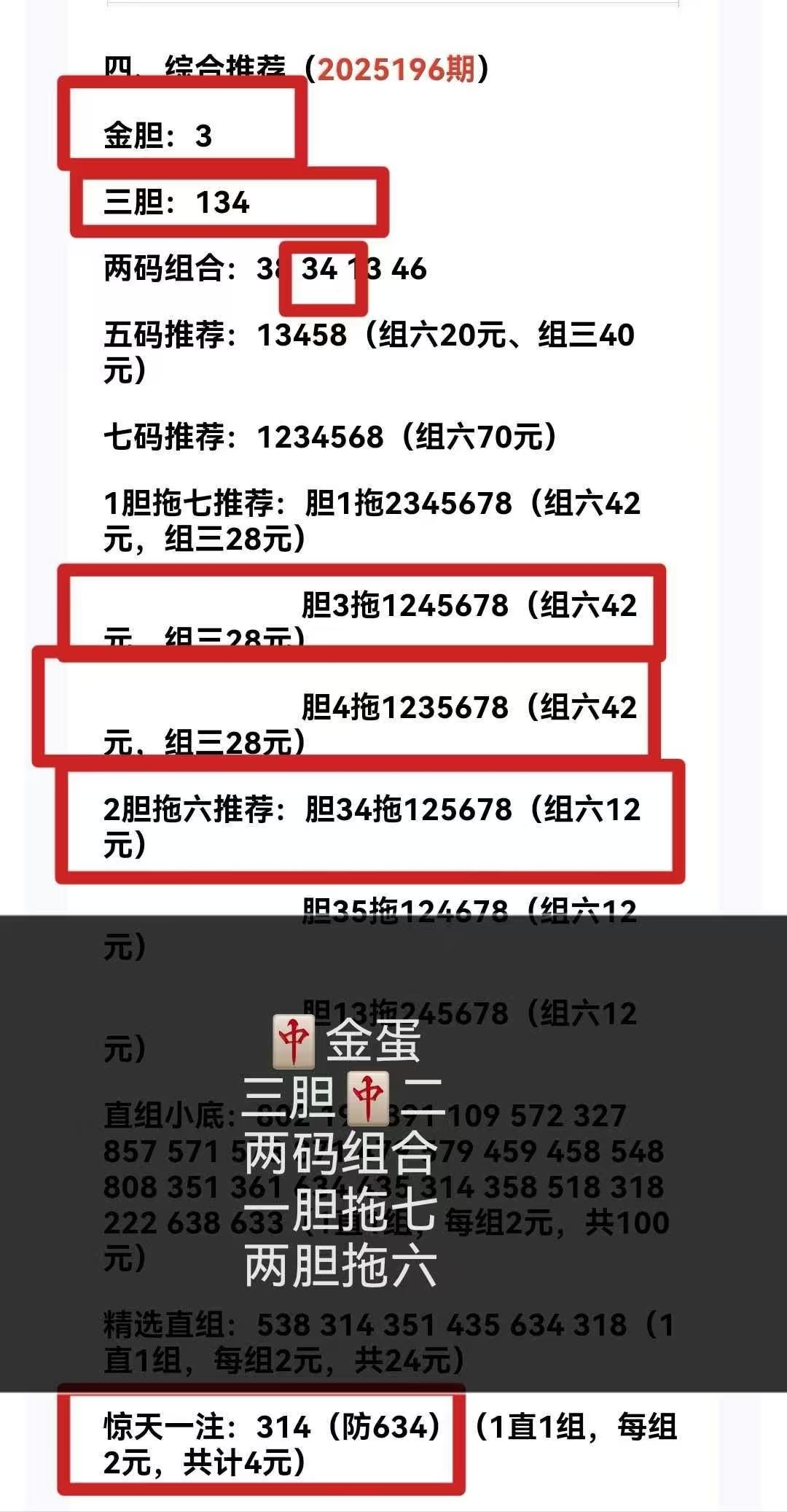 2025196期 命中金胆,三胆中二,两码组合,一胆拖七,两胆拖六