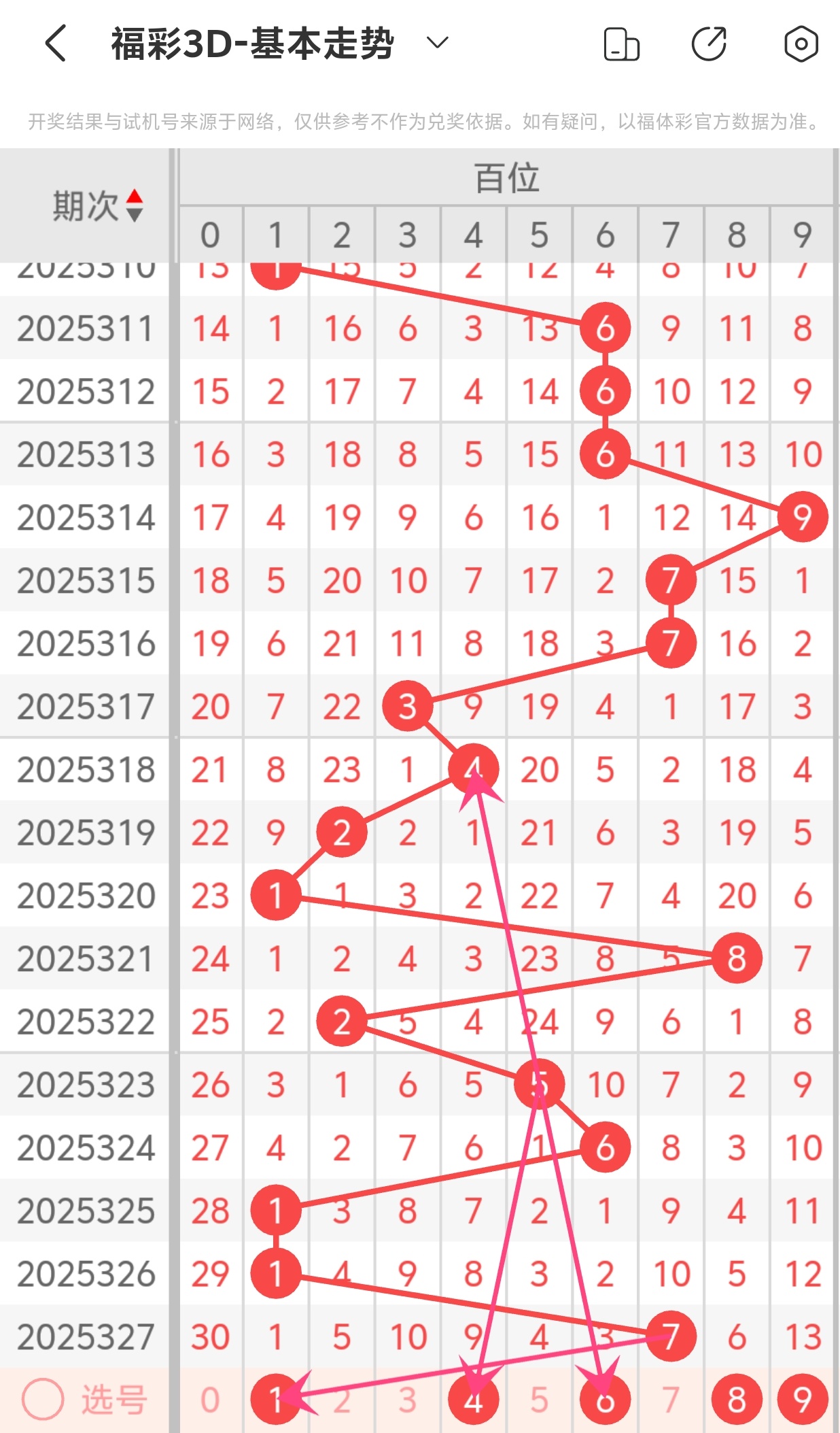 上期百位开出7,本区与上期的跨度为6,本期我们可以从上面走势图中看出选号的思路,1为隔期回补走势,4为斜连走势跨度为三,6为斜连走势跨度为一,综合以上分析,本期百位推荐:14689