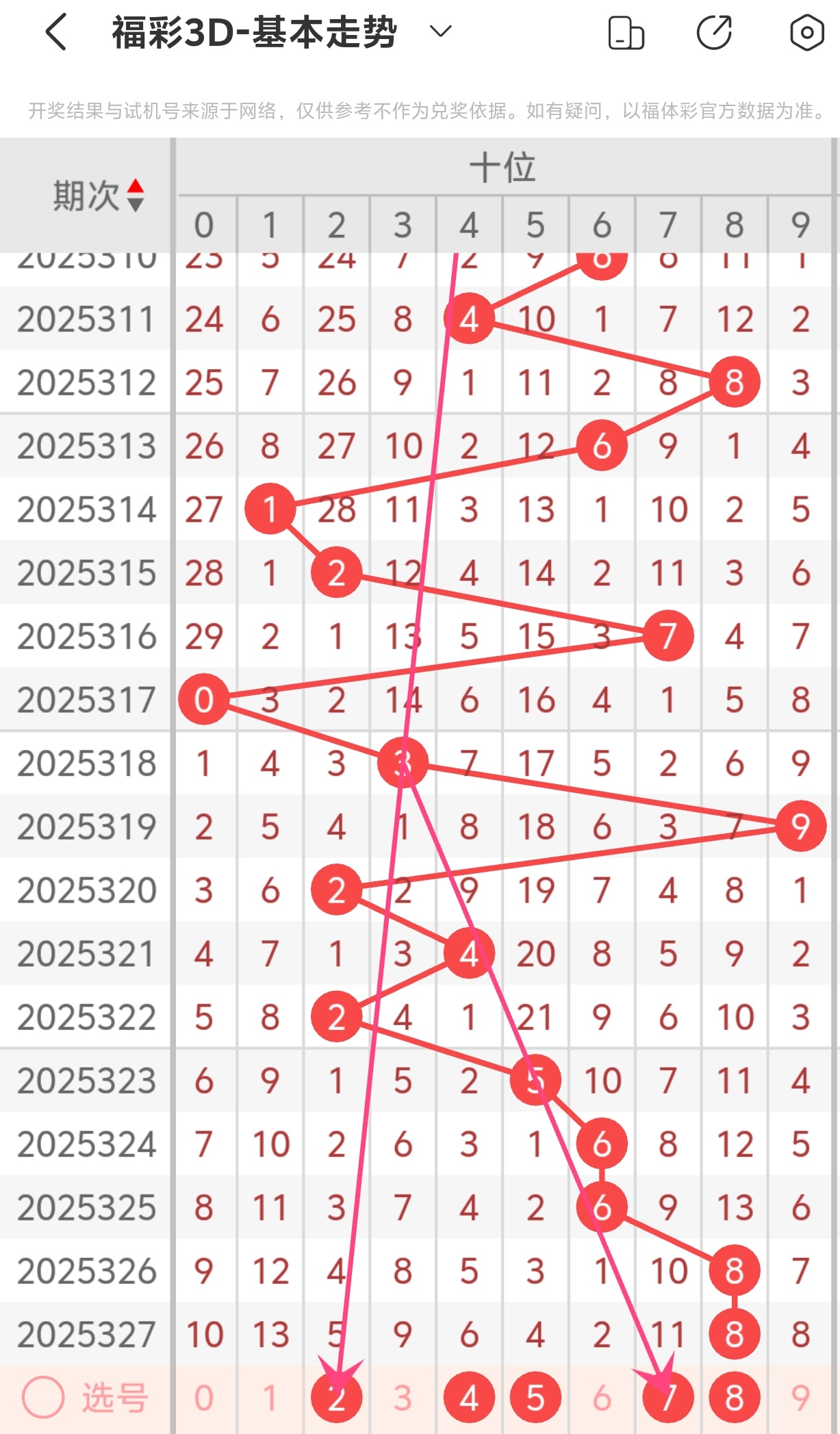上期十位开出8,本区与上期的跨度为0,本期我们可以从上面走势图中看出选号的思路,2为斜连走势跨度为六,7为斜连走势跨度为一,8为重码走势,综合以上分析,本期十位推荐:24578