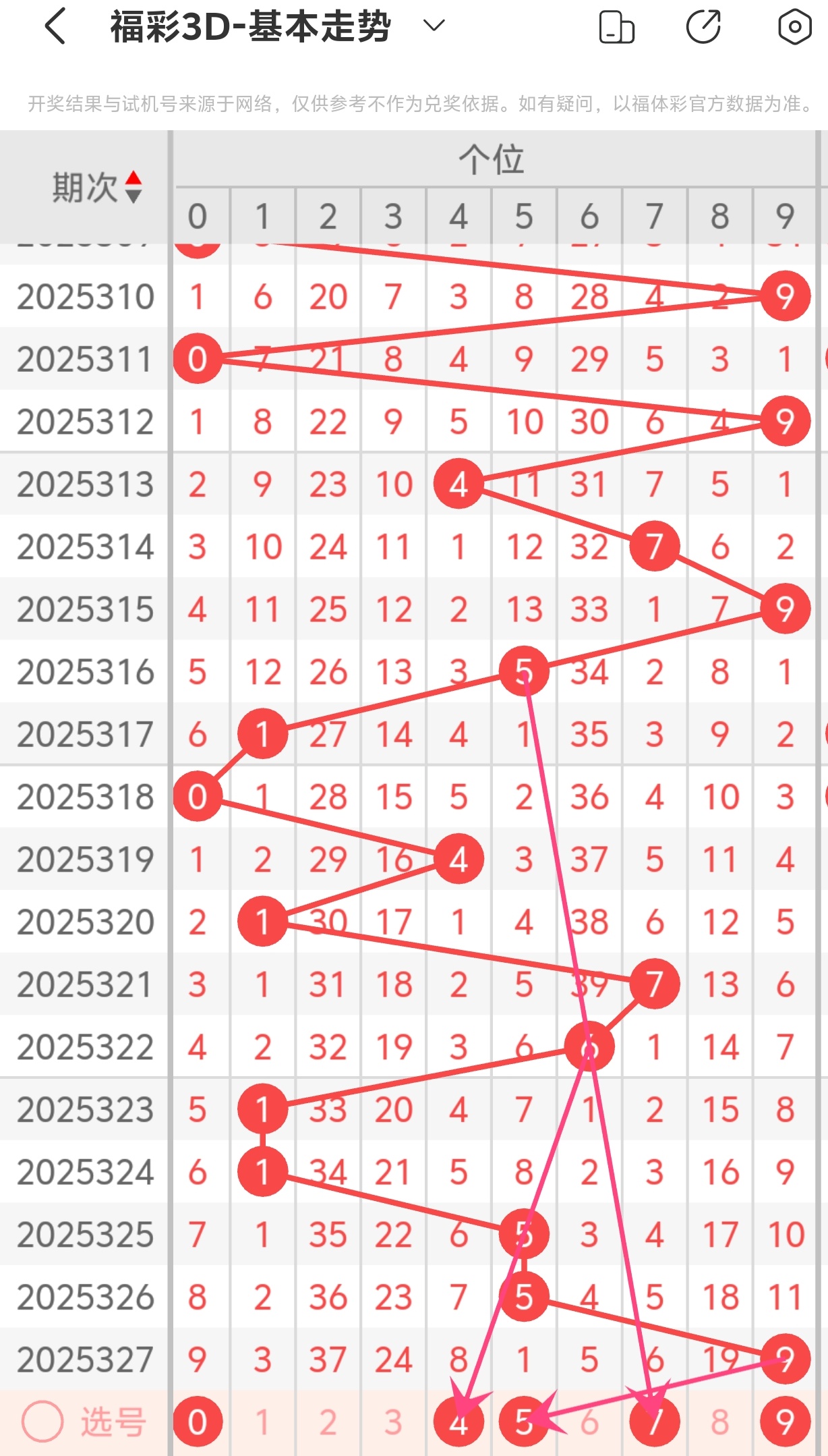 上期个位开出9,本区与上期的跨度为4,本期我们可以从上面走势图中看出选号的思路,4为斜连走势跨度为五,5为隔期回补走势,7为斜连走势跨度为二,9为重码走势,综合以上分析,本期个位推荐:04579