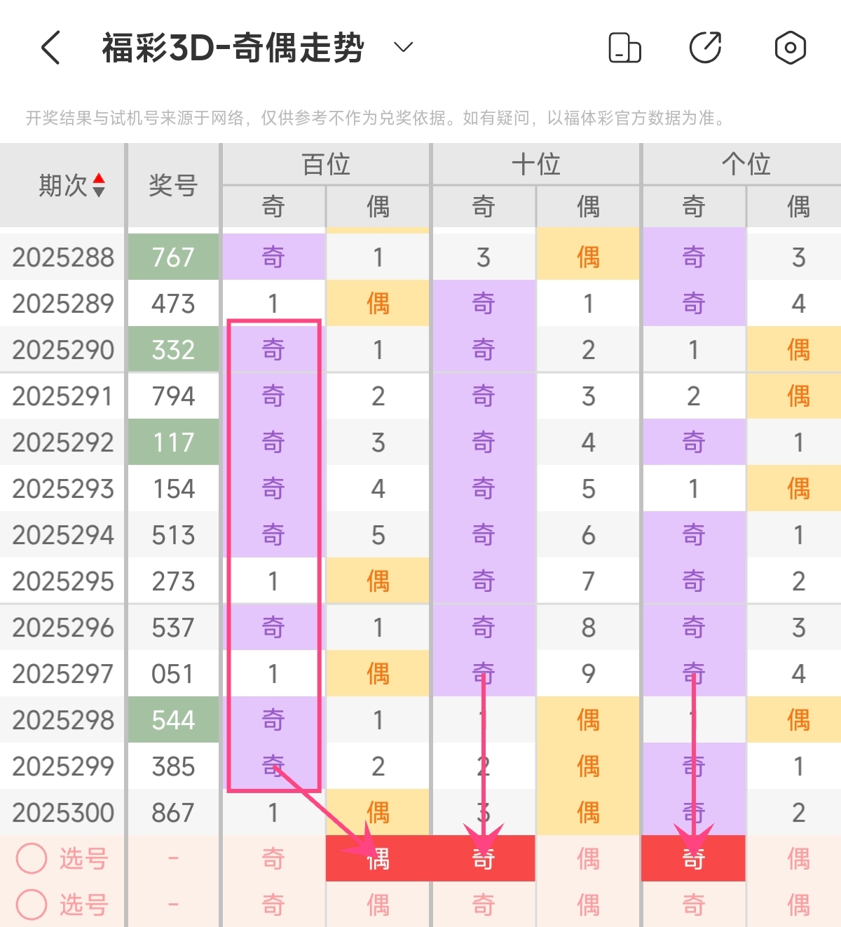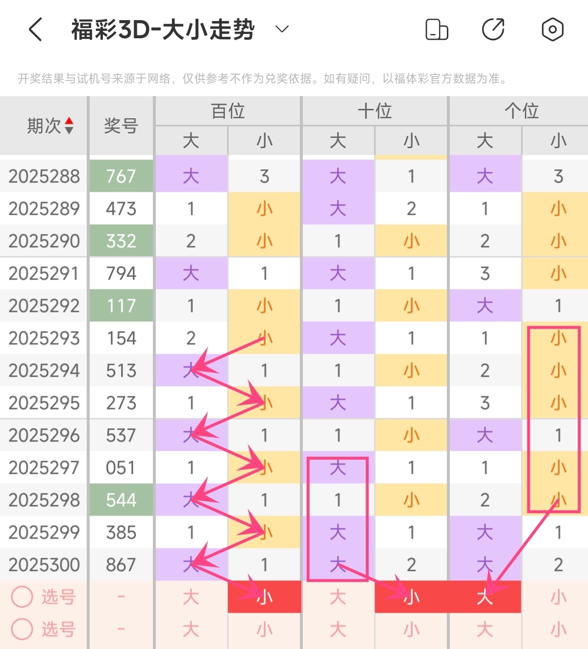 首先让我们回顾一下上期福彩3D第2025300期开奖号码为867,为组六形态,大小比为3:0,奇偶比为1:2,跨度为2,和值为21。