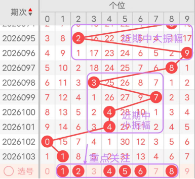 近7期(097~103)开奖号个位号码球分别为8、3、7、4、4、0、1,开奖号与上一期走出的振幅分别为1、5、4、3、0、4、1。097期走出8号大数号码球,走出“1”的小幅度,098期走出3号中小数号码球,走出“5”的中大幅度,099期走出7号大数号码球,走出“4”的中小幅度,100期走出4号中小数号码球,走出“3”的中小幅度,101期走出4号中小数号码球,走出“0”的小幅度,102期走出0号小数号码球,走出“4”的中小幅度,103期走出1号小数号码球,走出“1”的小幅度;从近期振幅大小的走势及大小走势来看,中大振幅走在5~7之间较为适宜,中小振幅走在0~4之间较为适宜;结合走势图的整体及大小走势分析,本期个位应重点关注号码球为1、2、4、5、6、8。
