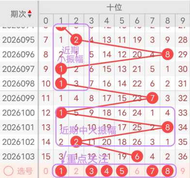 近7期(097~103)开奖号十位号码球分别为1、1、7、1、8、2、6,开奖号与上一期走出的振幅分别为7、0、6、6、7、6、4。097期走出1号小数号码球,走出“7”的大幅度,098期走出1号小数号码球,走出“0”的小幅度,099期走出7号大数号码球,走出“6”的中大幅度,100期走出1号小数号码球,走出“6”的中大幅度,101期走出8号大数号码球,走出“7”的大幅度,102期走出2号小数号码球,走出“6”的中大幅度,103期走出6号中大数号码球,走出“4”的中小幅度;从振幅大小及走势图的整体对应来看,中大振幅走在4~5之间较为适宜,中小振幅走在1~3之间较为适宜;结合走势图的上下对应及振幅大小分析,本期十位应重点关注号码球为1、3、4、5、7、8。