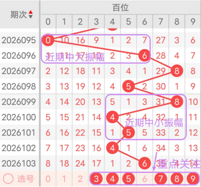 近7期(097~103)开奖号百位号码球分别为8、5、8、4、5、4、6,开奖号与上一期走出的振幅分别为2、3、3、4、1、1、2。097期走出8号大数号码球,走出“2”的小幅度,098期走出5号中大数号码球,走出“3”的中小幅度,099期走出8号大数号码球,走出“3”的中小幅度,100期走出4号中小数号码球,走出“4”的中小幅度,101期走出5号中大数号码球,走出“1”的小幅度,102期走出4号中小数号码球,走出“1”的小幅度,103期走出6号中大数号码球,走出“2”的小幅度;从振幅大小及走势图的整体形势,中大幅度走在3~4之间较为适宜,中小幅度走在1~2之间较为适宜;结合走势图的整体及大小走势分析,本期百位需重点关注号码球为3、4、5、7、8、9。