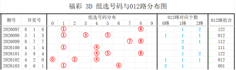 近7期(097~103)开奖号与012路组合分别为818(122)、513(012)、877(112)、414(111)、584(122)、420(012)、661(001),上期开奖号为001路组合,根据整体走势分析,本期看好的012路组合有:002、012、011,防001、022、122组合。