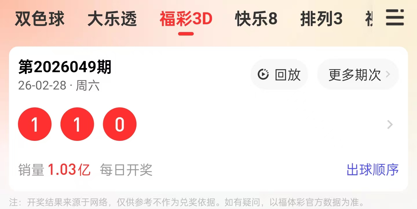 一、最新一期奖号回顾(2026049期:1,1,0)