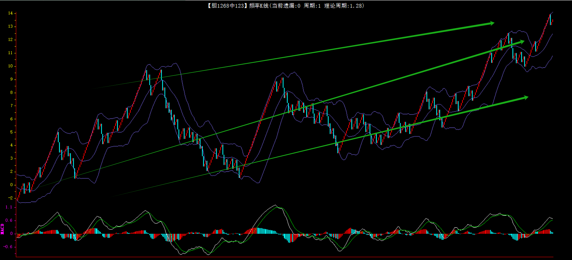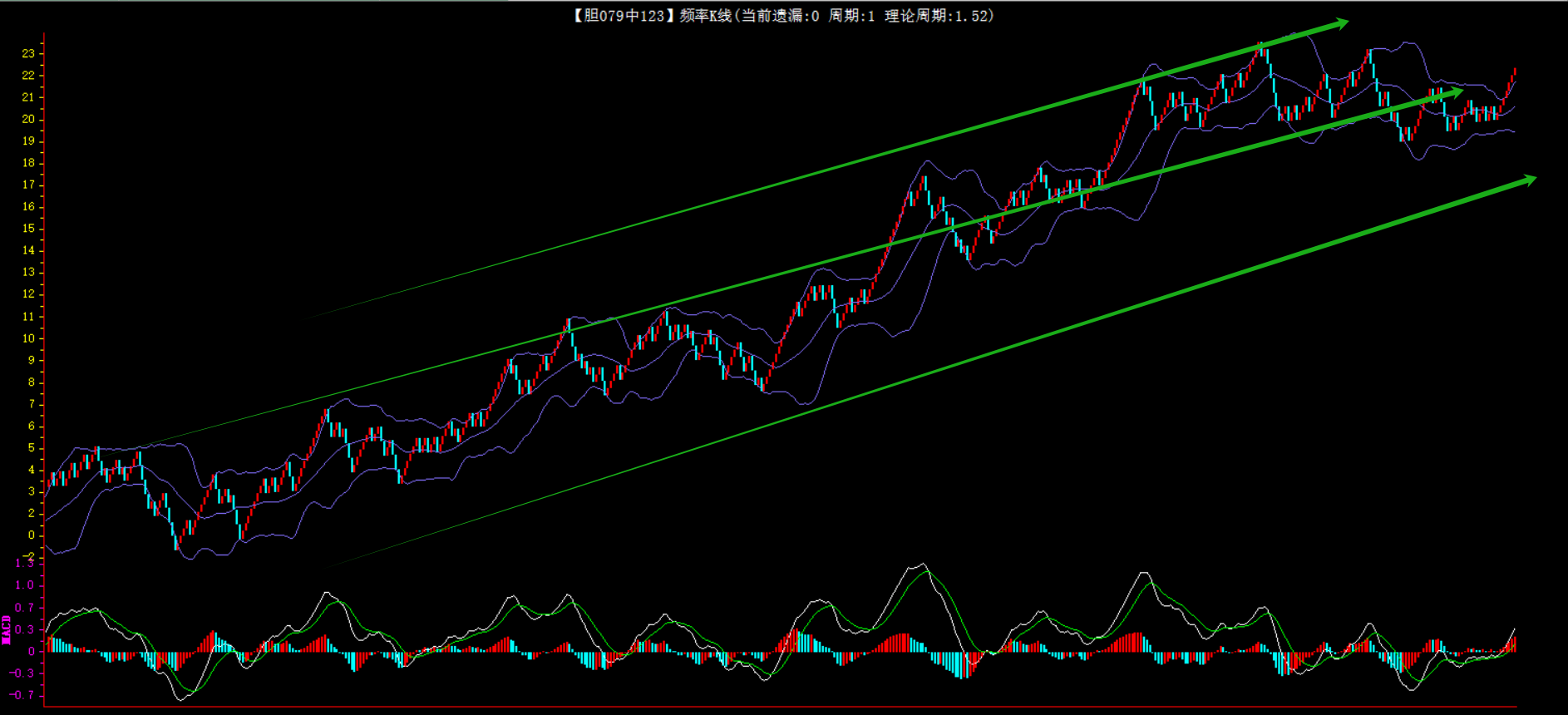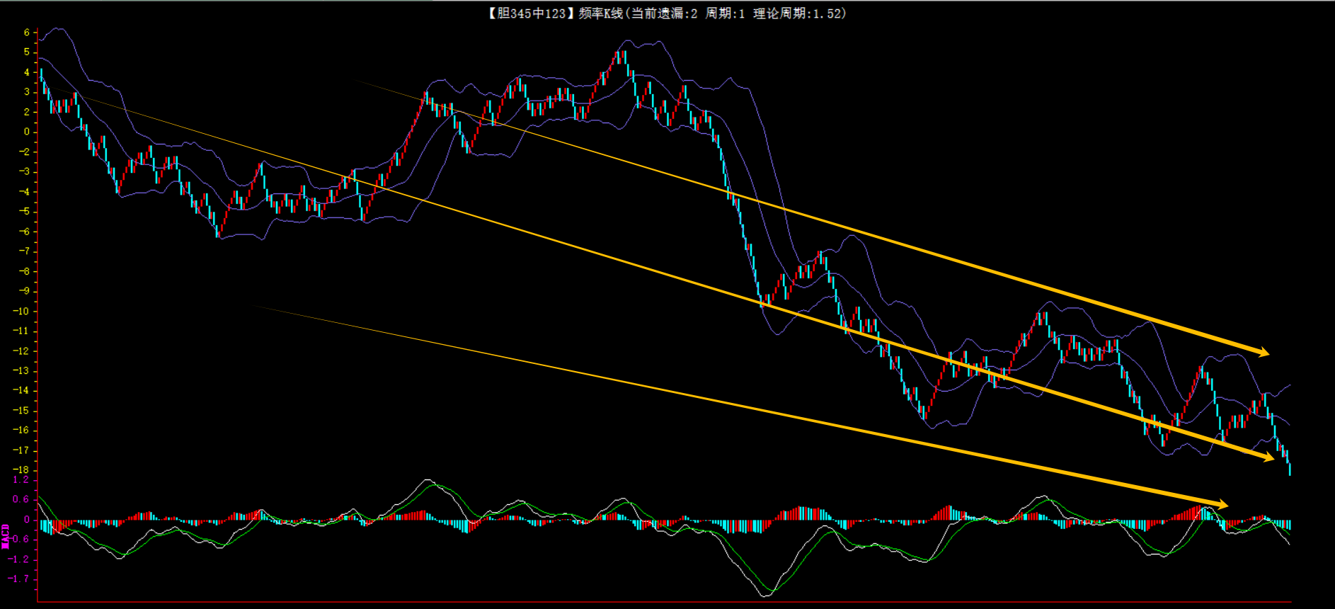 整体趋势下行,上边沿线趋势向下,下边沿趋势也是向下,节点震荡,当前遗漏2期,本期防守。