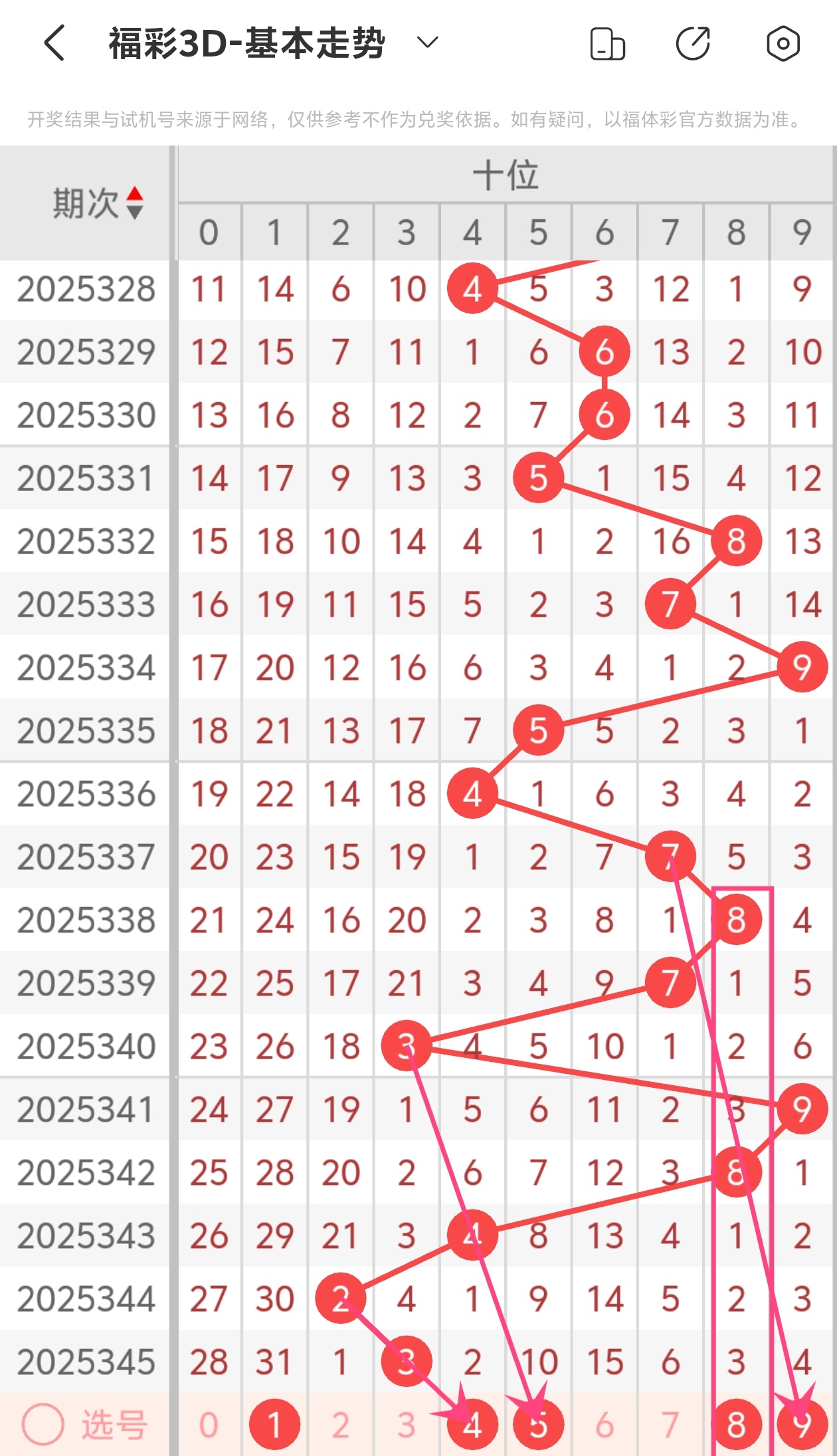 上期十位开出3,本区与上期的跨度为1,本期我们可以从上面走势图中看出选号的思路,4为斜连走势跨度为一,5为斜连走势跨度为二,8为对称形态走势跨五,9为斜连走势,综合以上分析,本期十位推荐:14589