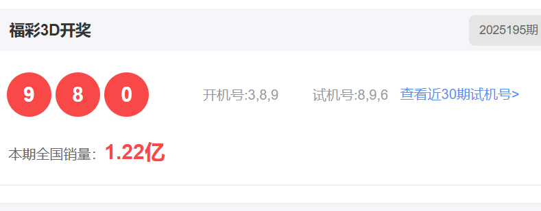 今天是2025年7月25,是3D的第196期开奖,那么3D上一期开奖的结果是980,是一个全跨的一个组合