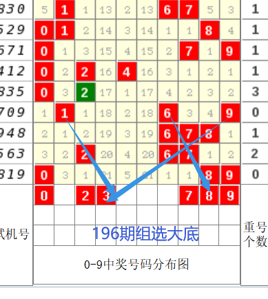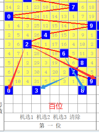 那么我们首先分析一下百位上期开了一个9,那么今天这个百位的话,嗯。从这个主观判断上看,是不大可能会进行重复的,那么它的位置呢,就可能会向左进行移动,那么向左的话啊,一个是走这个边号8一个是走那个根据这个07为参照点啊,进行往左进行旋转移动啊,会走一个比较远的一个位置,分别是0和3