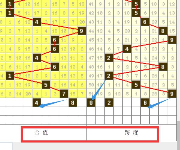 最后呢,我们还是看一下这个和值啊,和值的尾还有跨度这个走势图,那么上期980开了一个17点,所以它的尾数就是7,那么跨度的话是980也是一个9跨的一个跨度。那么我们看一下本期它的和值和跨度,嗯,我在走势图上已经标示出来
