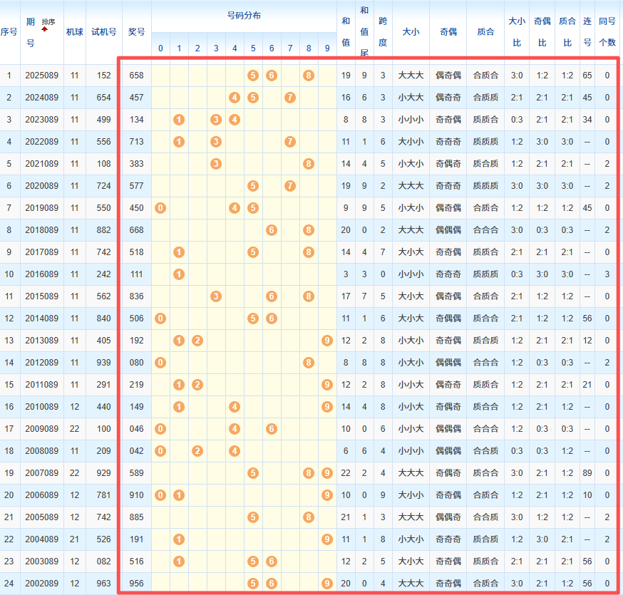 1、统计往年同期开奖号码