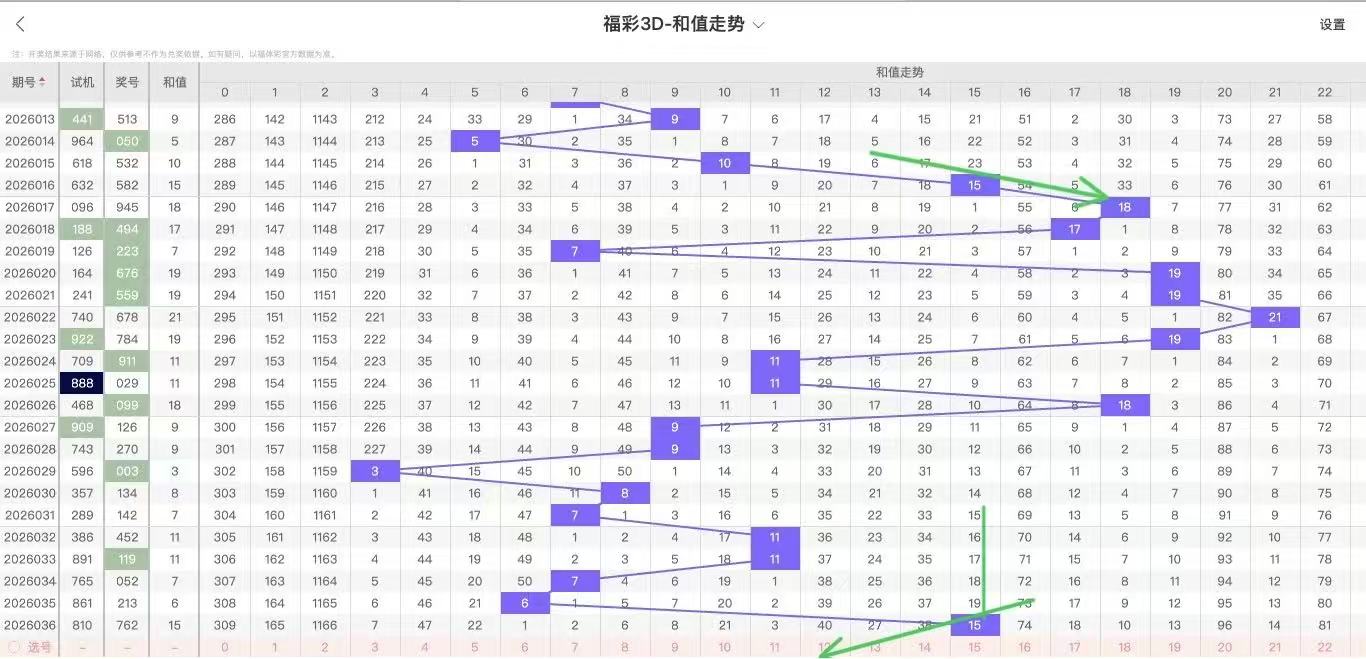 2026037期福彩3D和值走势图如下:上期开出和值15,和值在第2分区,而近百期开出和值15共8次,下期数据.6 12 4 8 15 10 18 根据和值15的下期钟摆走势来看升趋势稳定,近期和值喜在第2分区活动,和值形态规律:偶:小和尾形态偶:小,那么本期重点推荐值范围是:9-19主偶形态