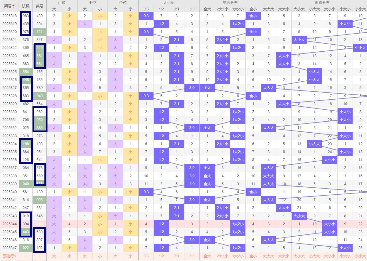 大小走势分析 在347期中,开奖号码为192.;奇奇偶形态;大小比为1:2,小数占据优势。回顾历史数据,发现大小比常常在短期内呈现波动,但长期趋于平衡。因此,在348期中,相信大小比将继续调整,倾向于保持大数优势。基于这一逻辑,预判348期的大小走势可能为“大中小”或“中小大,这样的组合不仅符合历史波动规律,也体现了当前大小比调整的趋势。近十期大小比为19:11大数占据优势,关注两小一大号码