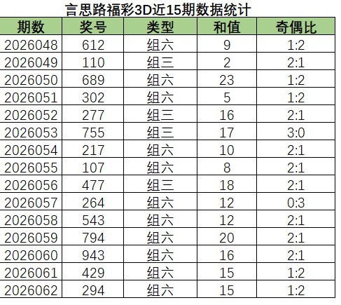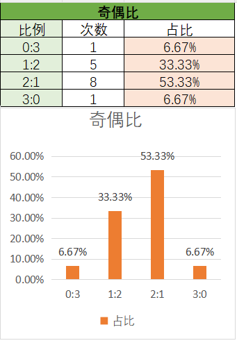 上期奇偶比为1:2,其中1:2占比变大,2:1占比变小。近15期内2:1优势最好,然后是1:2,最后是3:0和0:3。上期开了1:2奇偶比,本期看好2:1奇偶比的开出,其次是1:2。
