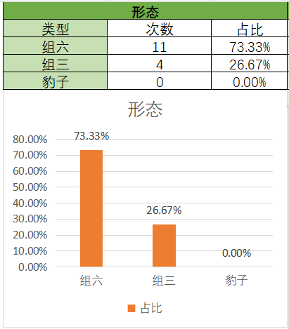 上期开的是组六,各个类型占比没有变化。通过图示可以看到,组六在15期内开了11期,组三开了4期。本期关注组六,防组三。