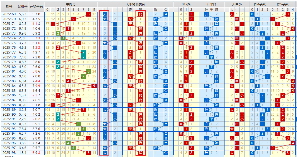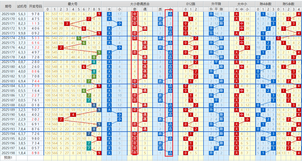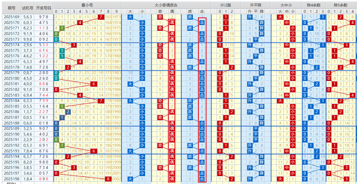 2025198期开出898,最大号9,中间号8,最小号8,和值25,均值8,跨度1