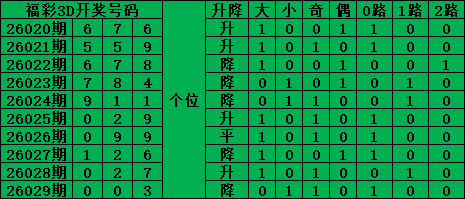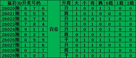 福彩3D是从0-9每期开出3个号码,截至2026029期三个位置最大遗漏的是34期的:百位的8号。