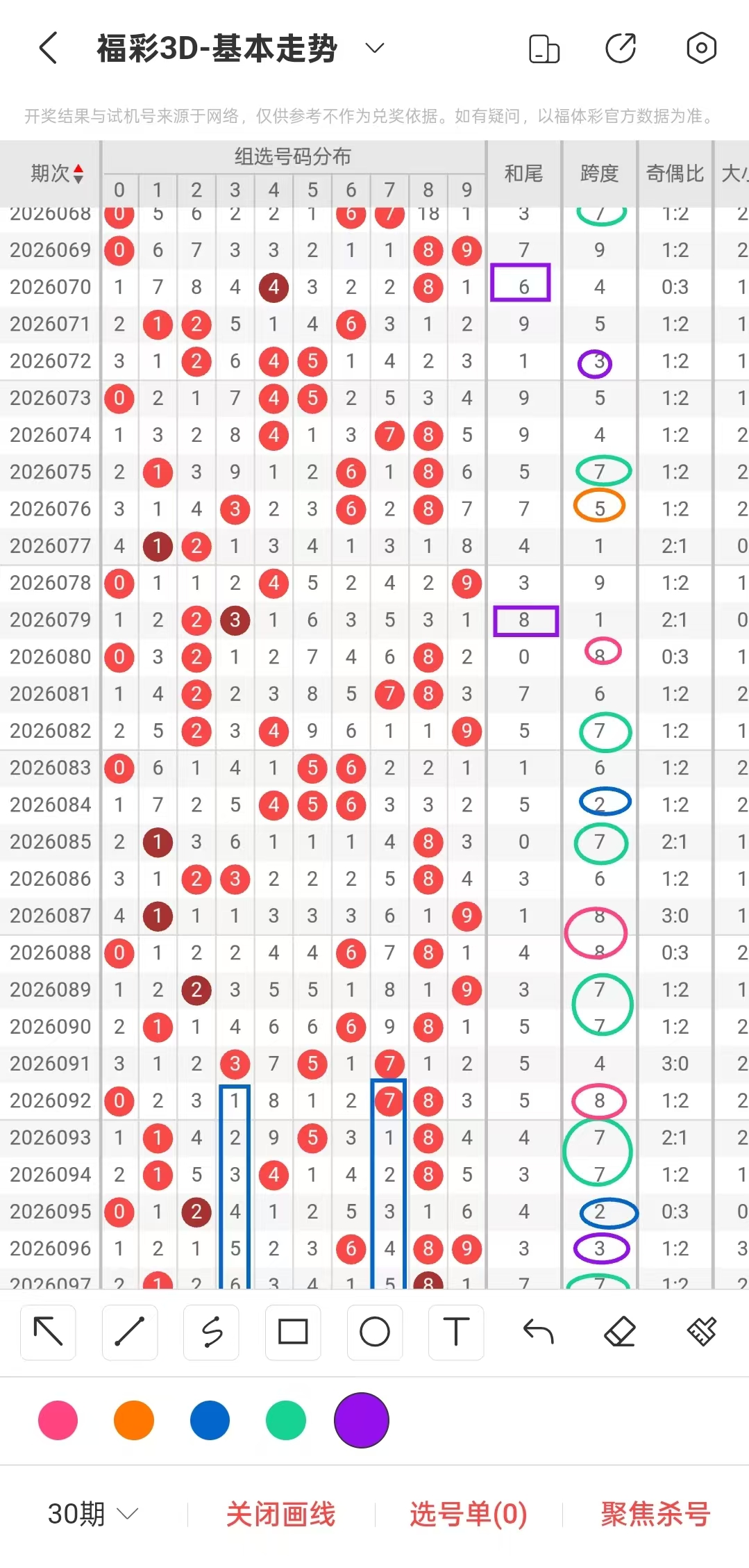 3.近30期中,跨度7出现次数最多为热跨度,2.3跨度比较温冷后面会回补,6跨和冷8跨后面可能走热,7跨可能走冷,注意跨度5的回补。所以近期需要重点关注2,3,5,6,8跨度。