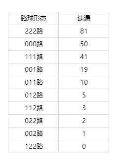 1.首先是观察222路、000路以及111路的组合,其中全二路的组合遗漏81期,000路遗漏50期,111路遗漏41期。近期需重点关注开奖号码为222路的回补。