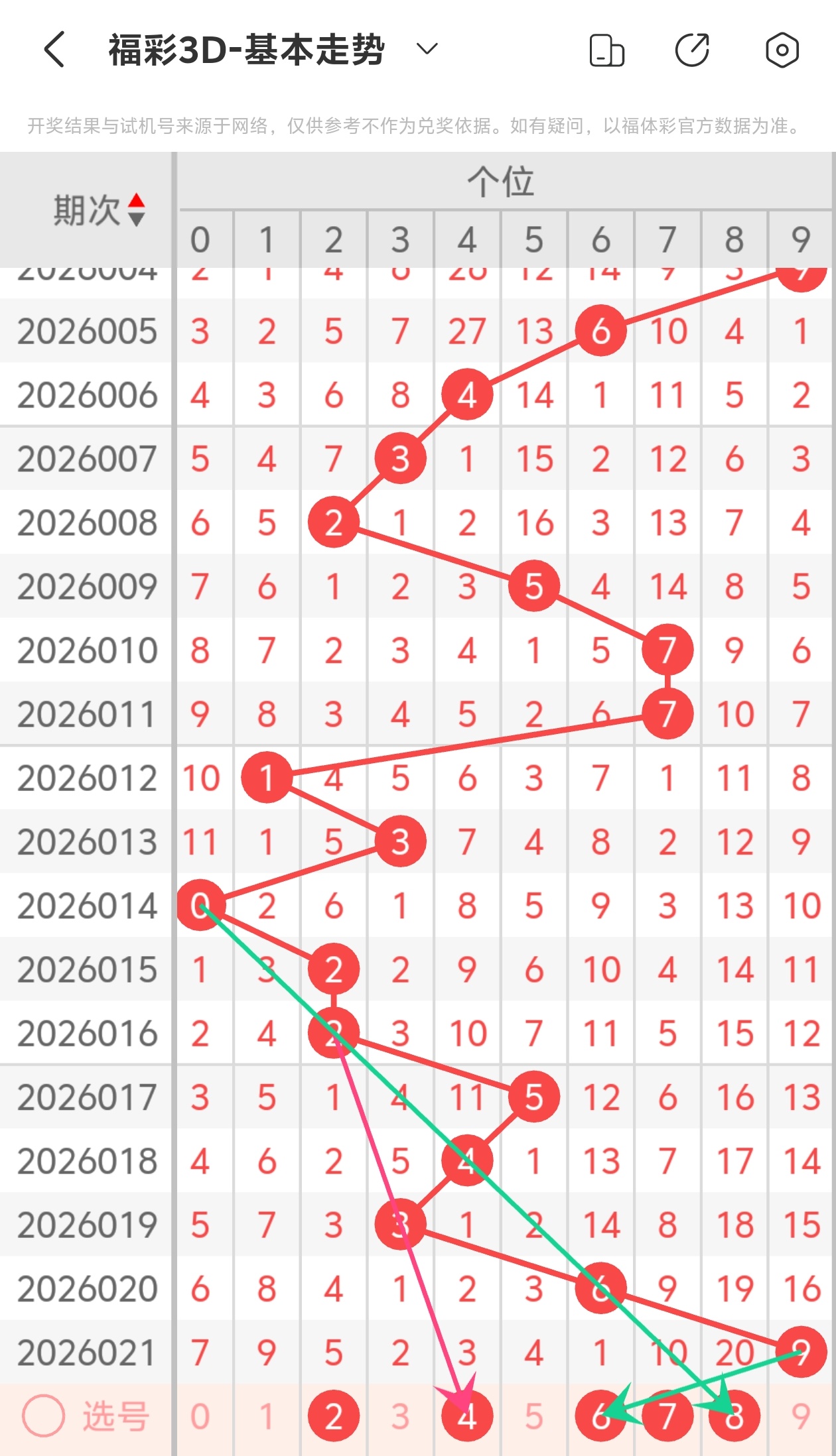 上期个位开出9,本区与上期的跨度为3,本期我们可以从上面走势图中看出选号的思路,4为斜连走势跨度为五,6为隔期回补号,8为斜连走势跨度为一,综合以上分析,本期个位推荐:24678