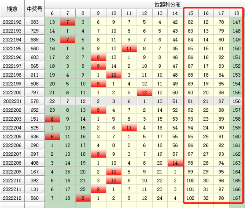 当然这是一组同冷号码,位距和15、16、17、18,一共是4个位距和,如果4者再去选择一个,到底选择哪个位距和比较好呢?这个时候就要纵向比较,看看到底哪个位距和遗漏值最适合号码的开出。