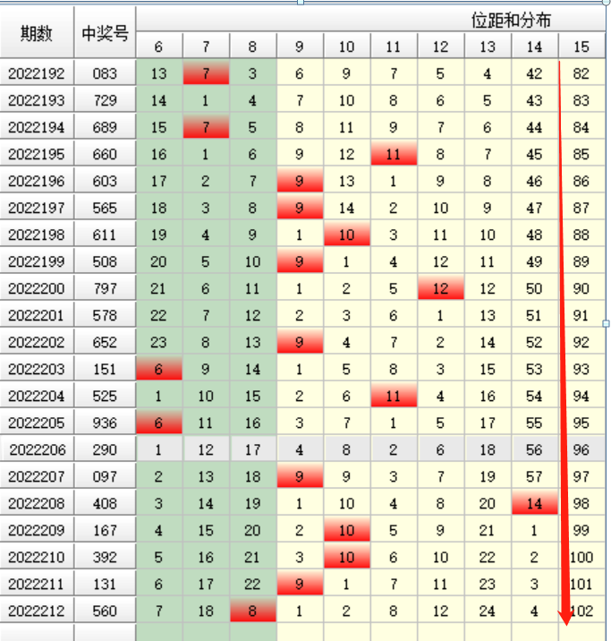 那么此时我们只能去选择位距和为15了,此时我们看到位距和为15遗漏值为102期,并且位距和为15是单选号码最多的位距和值,此时我们再对比下历史记录,去选择位距和15的最大遗漏值。