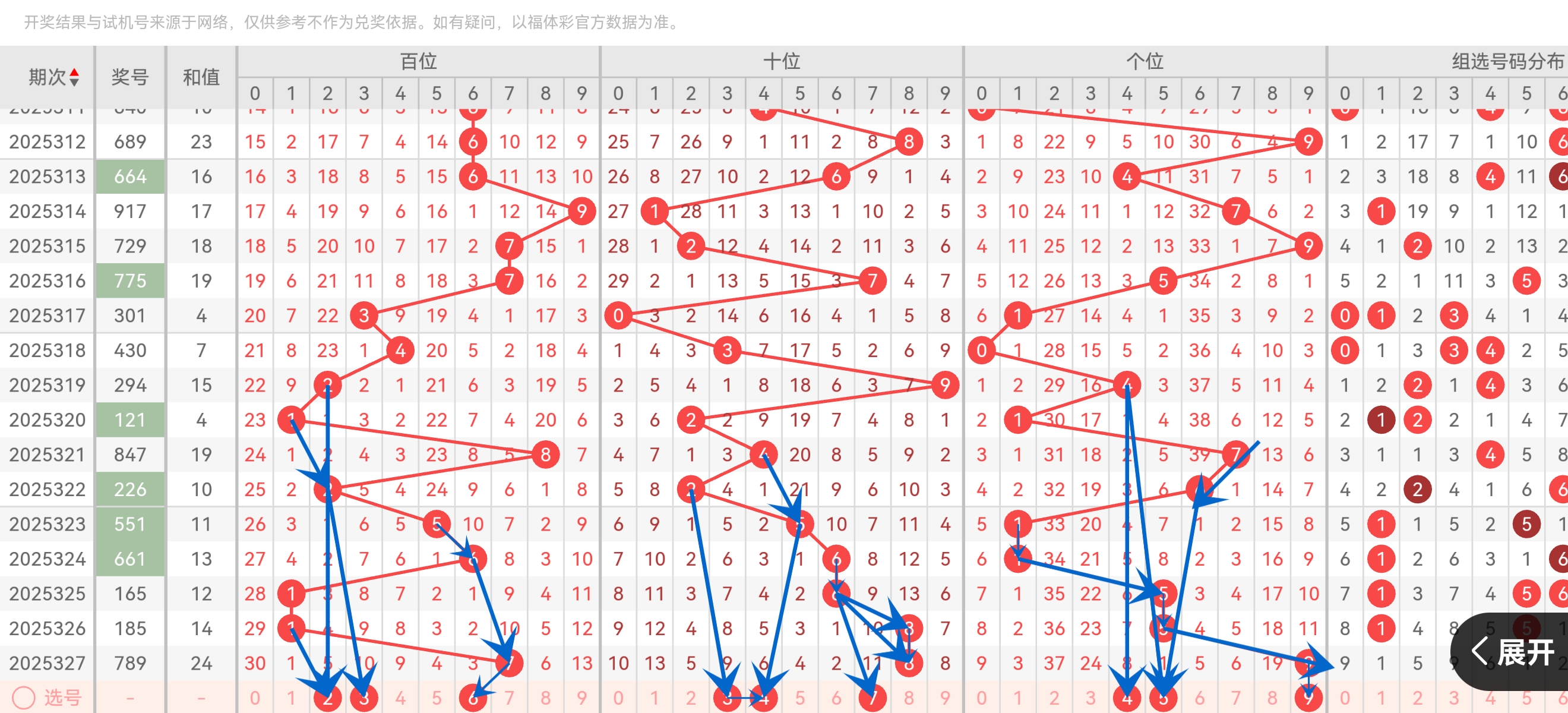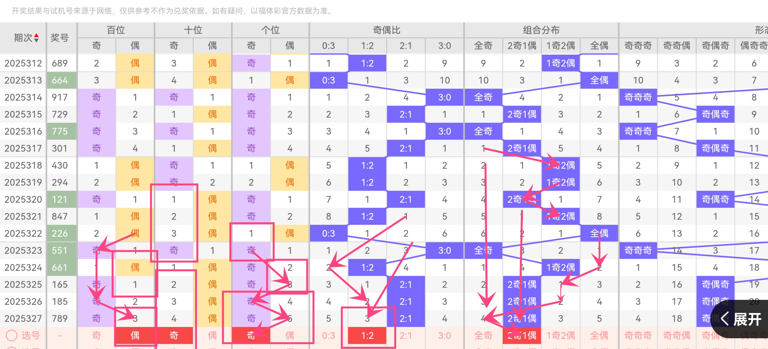 跨度4近5期出现2次(40%),中小跨度(2-5)占比80%。上期(25321期)跨度4后,历史规律显示跨度4易连开 。