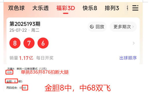 金莱3D第194期:上期金胆6对,双飞68对,单挑836开876错失大奖