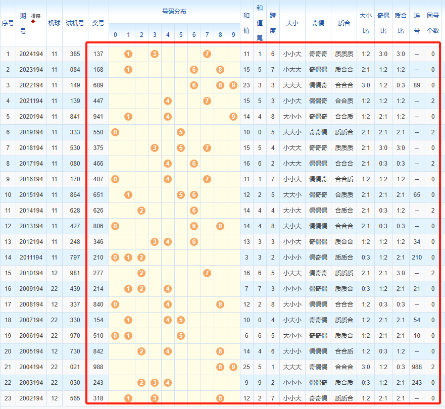 这23期大小比1:2出靠前,这期可以考虑选1:2。奇偶2:1出靠前,奇偶比可以考虑2:1
