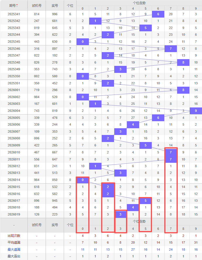 上期个位:3,近10期个位出号:7 7 1 3 0 2 2 5 4 3。最近10期大小变化分别:大大小小小小小大小小,奇偶变化分别:奇奇奇奇偶偶偶奇偶奇,质合变化分别:质质质质合质质质合质,根据近10期规律本期综上所述个位出号推荐5个号码:0 2 3 5 7。
