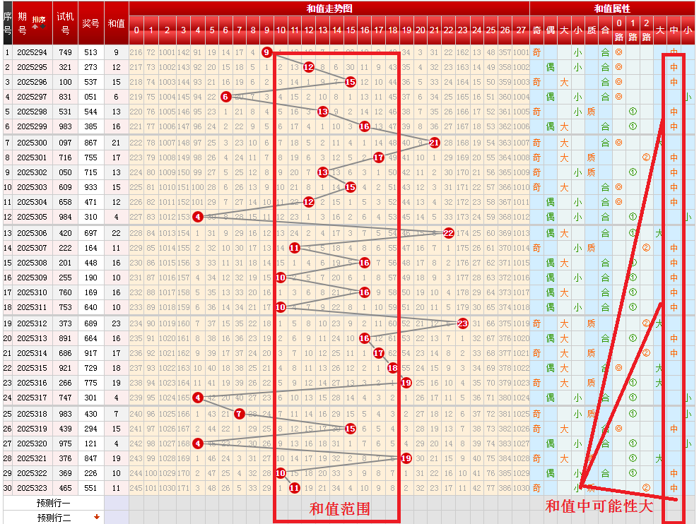 从上图可以开出,按和值大(14-27)小(0-13)分区,上期开出和值小,按近期趋势和跟随表现,本期和值大小都有可能。