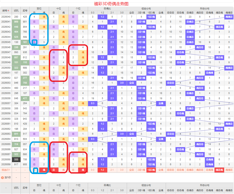 上期奇偶比是1:2,两偶的号码组合方式,从近五期的奇偶数出现情况看,奇数出现8次,偶数出现7次,奇数偶数号码出现较平均,本期侧重两偶的号码组合,侧重偶奇偶或奇奇偶的号码组合方式,根据奇偶形态做五码定位02468/13579/02468或13579/13579/02468