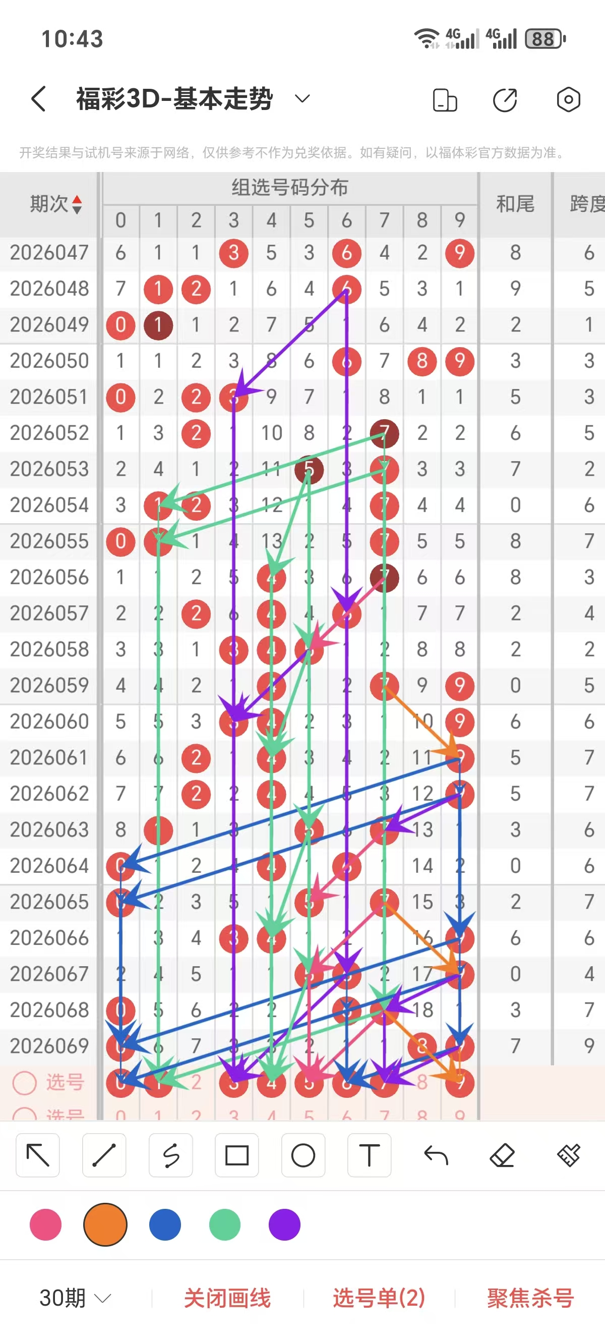 跨度通常情况下在五期之内重复一个跨度的概率很高,近五期重复了7的跨度,近五期跨度为7/6/4/7/9,近期01路的跨度较热,上期是0路的跨度,本期要侧重跨度以3/4/5跨为主的号码组合。可以从跨度方面选择相应的双胆码组合,双胆码的选取要根据近期和历史的走势进一步的分析选取。