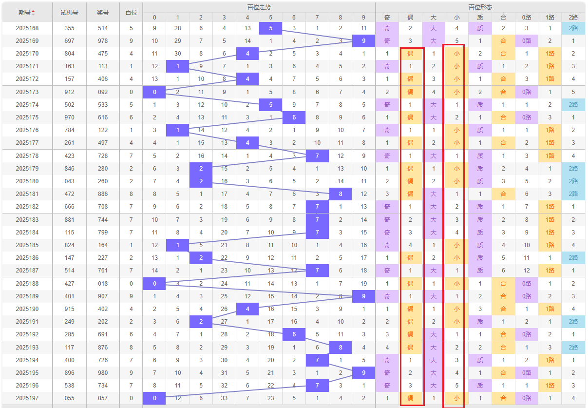 大中小分析:近30期百位大数(7-9)出现8次,中数(3-6)出现12次,小数(0-2)出现10次。中数占比40%,近期中数有回补趋势,重点关注4、5、6。