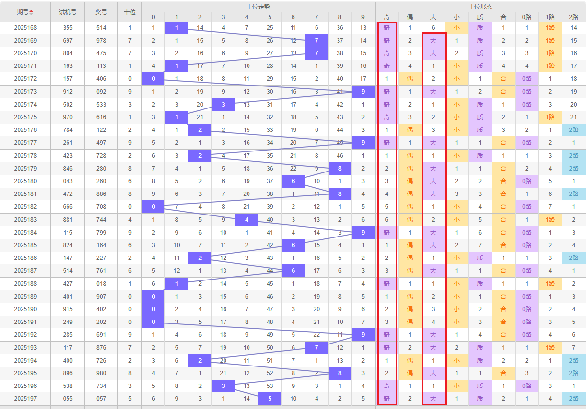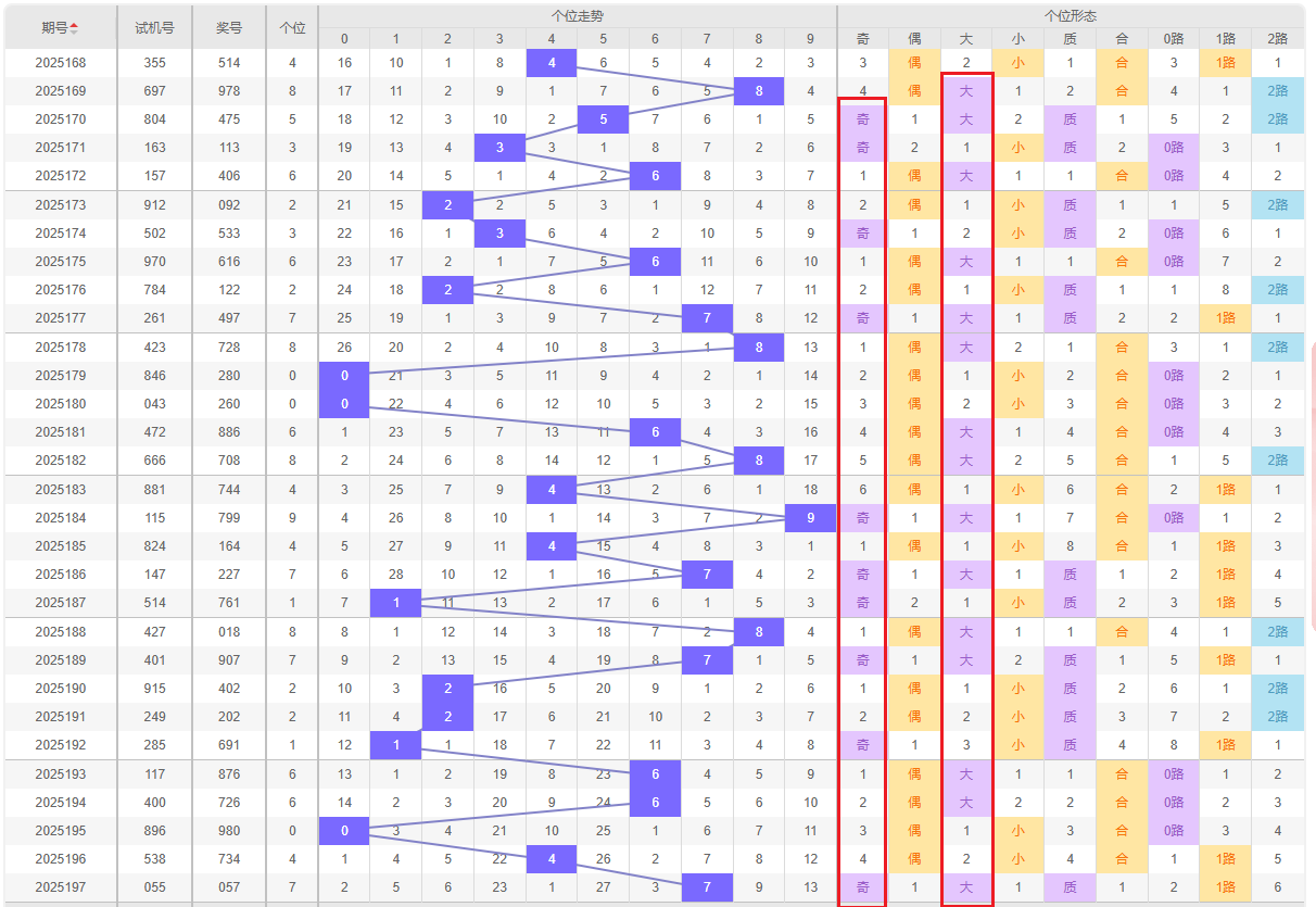 奇偶分析:奇数15次,偶数15次。奇偶均衡,近期奇数略多,关注1、3、5。