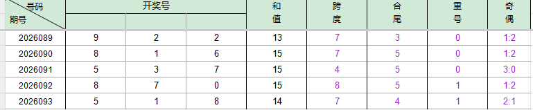 2026089期开奖号码922,我们可以看出近30期百位9出现5次,十位2出现2次(较091期减一),个位2出现5次。