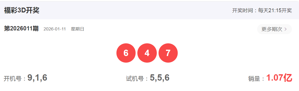 福彩3D2026年1月11日第011期开奖号码是647,组六形态,和值17,跨度3,偶偶奇,大小大