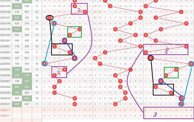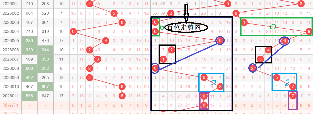 这是一张叠加图,利用百位来分析个位,为了方便和大家更清楚的看的,我把走势图裁剪下来,在百位开出了黑颜色框21,在个位开出了黑颜色框43,在百位蓝颜色线条8和0相加等于8,8和0是由大到小的排列方式,在个位蓝颜色线条6和2相加也等于8,6和2也是由大到小的排列方式,在百位绿颜色框开出了00,00相加等于0,在个位绿颜色框开出了19,1和9相加也等于0,在百位青颜色框开出了6和8,6和8相差等于2,6和8是由小到大的排列方式,在个位开出了青颜色框5和7,5和7也是由小到大的排列方式,那么轮到今天,在百位开出了紫颜色框66,66相加等于12,66相差等于0,在个位紫颜色会不会开出77,或者75,推荐个位7和5,文字表达不太清楚,大家可以观看上面的视频