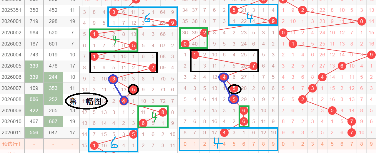 这是一张叠加图,也是大家中过的走势图,利用十位来分析十位,黑颜色框是17和圈5是坐标,蓝颜色线条都是由小到大的排列方式,绿颜色框和值差值上下都是对称,今天会不会青颜色和值差值对称,文字表达不太清楚,大家可以观看上面的视频
