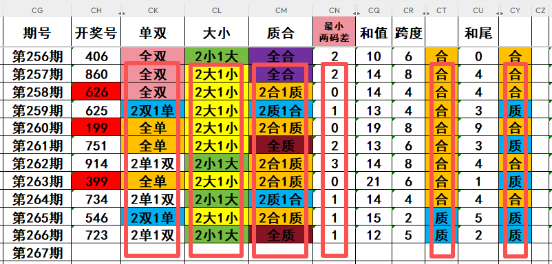 4,最近10天当中,最小两码差0开出3次,最小两码差1开出4次,最小两码差2开出2次,最小两码差3开出1次,