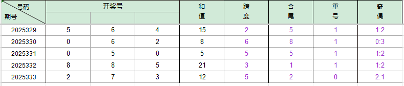 2025329期开奖号码564,我们可以看出近30期百位5出现2次,十位6出现7次,个位4出现4次。