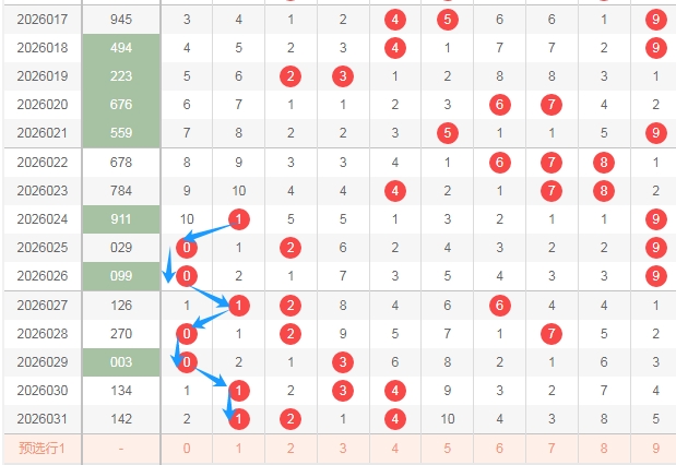 我在上面走势图中标注出来的蓝色小箭头表示的就是左边这个数字之间的跨度,看上面蓝色小箭头会发现,最近几期这个跨度都是走跨度0和跨度1的,都是小跨度走势,那么本期个人关注就是关注这个跨度走大,至少不要再次走跨度1和跨度0的走势。